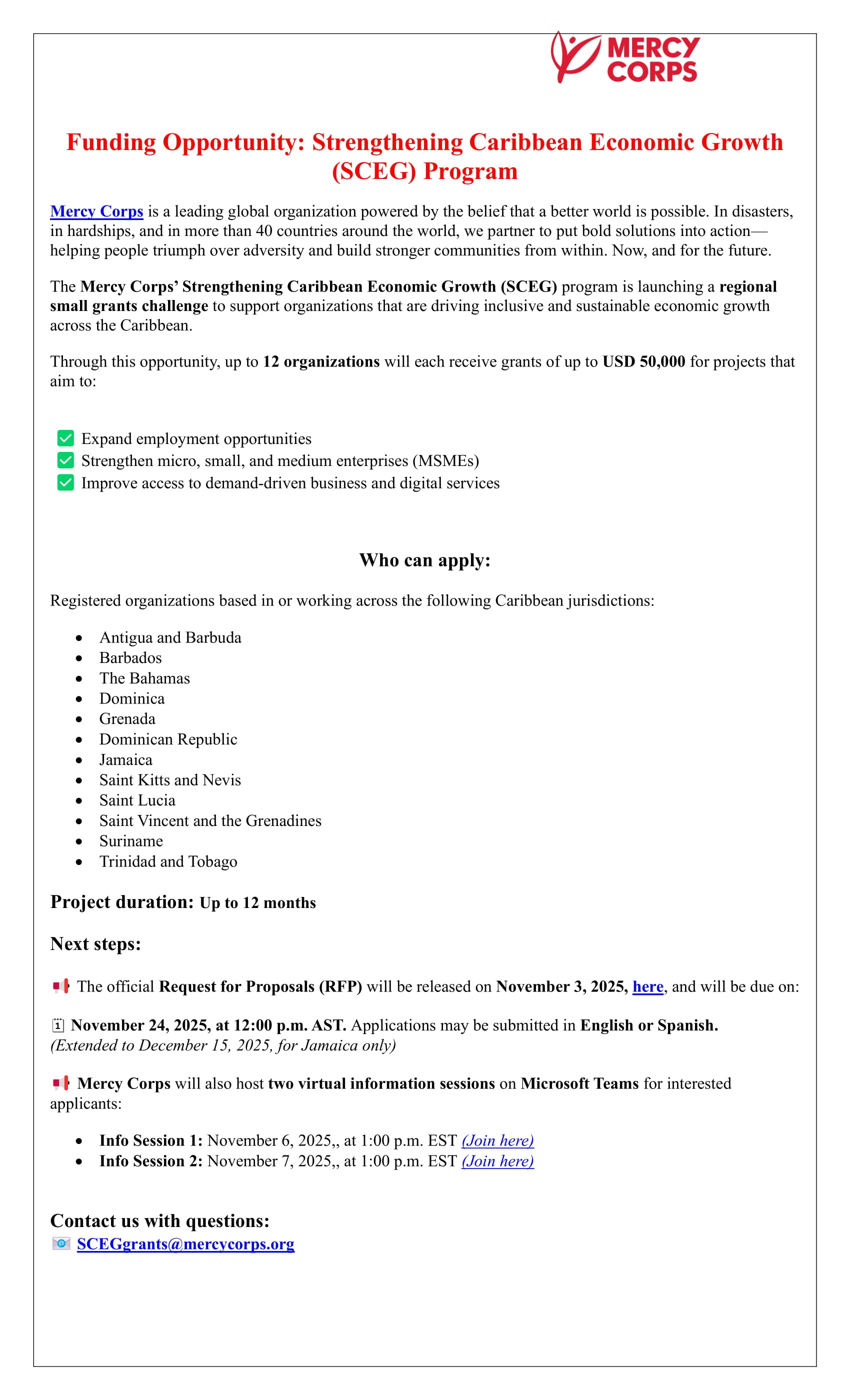 Mercy Corps: Call for proposals - Strengthening Caribbean Economic Growth (SCEG) Program Small Grants