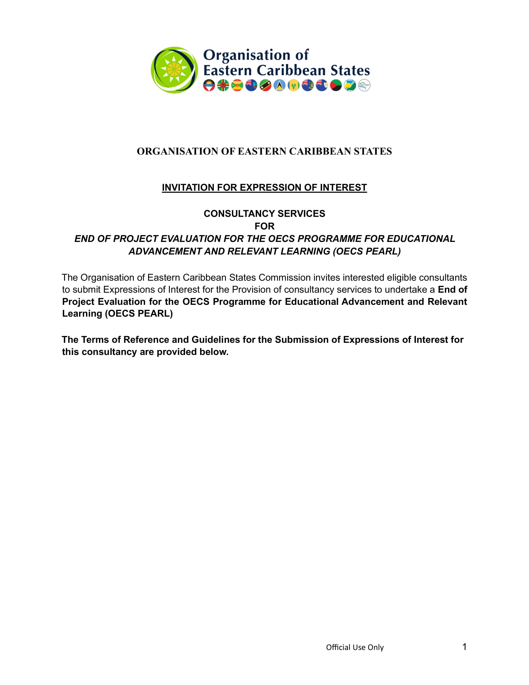 The email submissions should include the name and address of the Individual Consultant and shall be clearly marked in the subject line as “Expression of Interest – End of Project Evaluation for the OECS Programme for Educational Advancement and Relevant Learning (OECS PEARL)”
