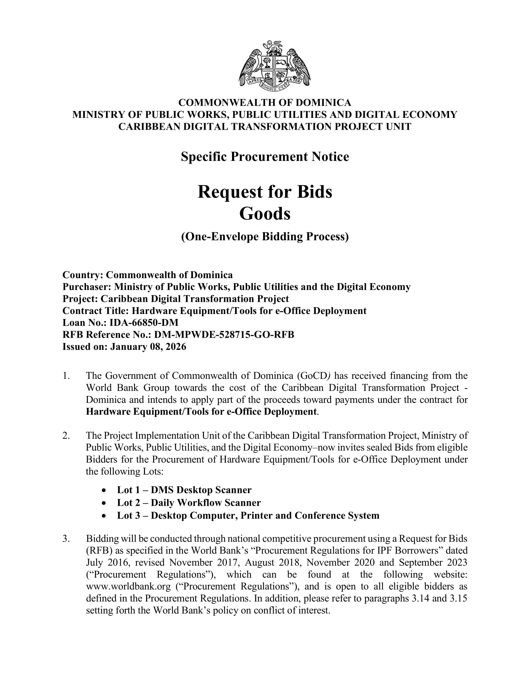 Bidding will be conducted through national competitive procurement using a Request for Bids (RFB) as specified in the World Bank’s “Procurement Regulations for IPF Borrowers” dated July 2016, revised November 2017, August 2018, November 2020 and September 2023 (“Procurement Regulations”), which can be found at the following website: www.worldbank.org (“Procurement Regulations”), and is open to all eligible bidders as defined in the Procurement Regulations. In addition, please refer to paragraphs 3.14 and 3.15 setting forth the World Bank’s policy on conflict of interest.