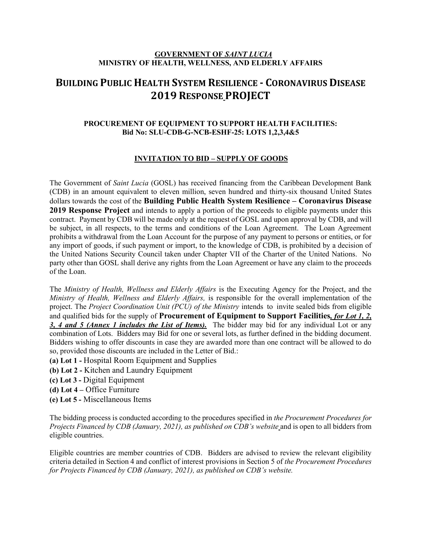 Bids must be submitted via the Saint Lucia Electronic Government Procurement portal (eGP): https://in-tendhost.co.uk/goslprocurement/aspx/Home no later than 9:00 a.m. AST on November 19, 2025. Bids will be opened publicly immediately after the deadline for submission of bids, in the presence of Bidders' representatives who choose to attend at the second address below. Qualification information only must be submitted simultaneously to the third address below.