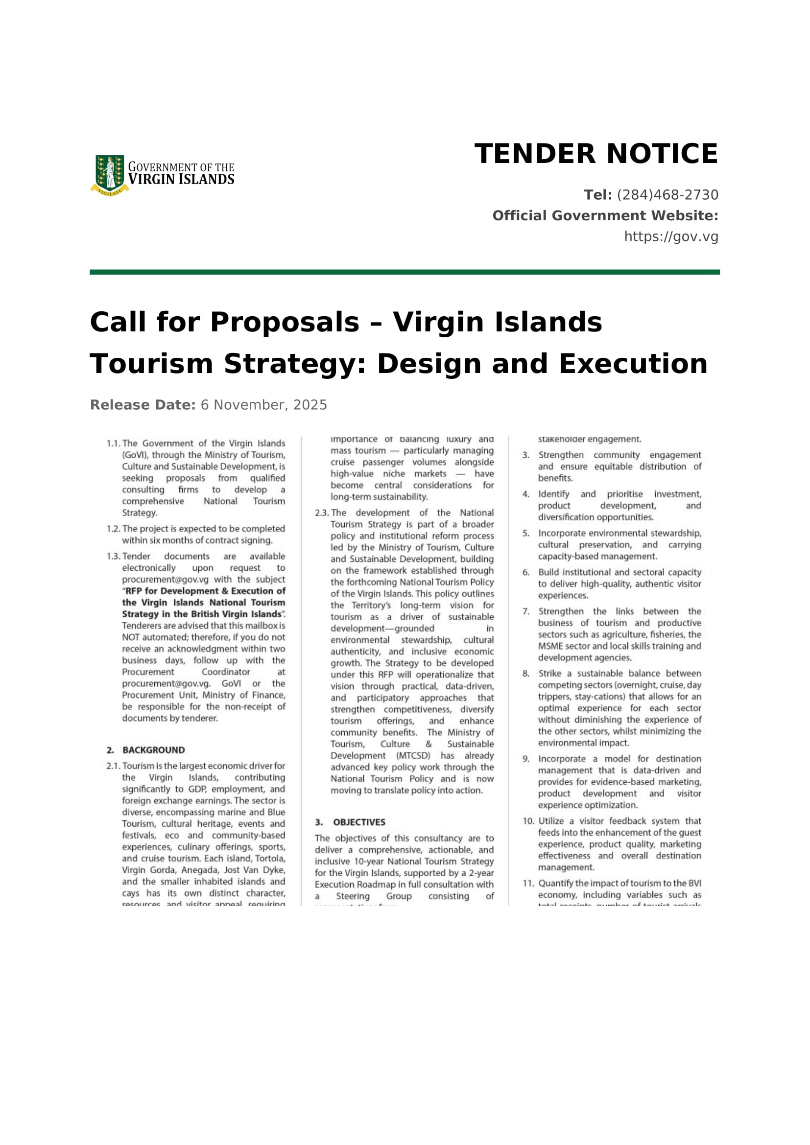 This Request for Proposals (RFP) seeks qualified firms with proven expertise in strategic planning, tourism development, and project execution to help shape the Territory’s tourism future. The selected firm will be expected to deliver a comprehensive strategy that enhances the Virgin Islands’ global competitiveness, sustainability, and visitor experience.