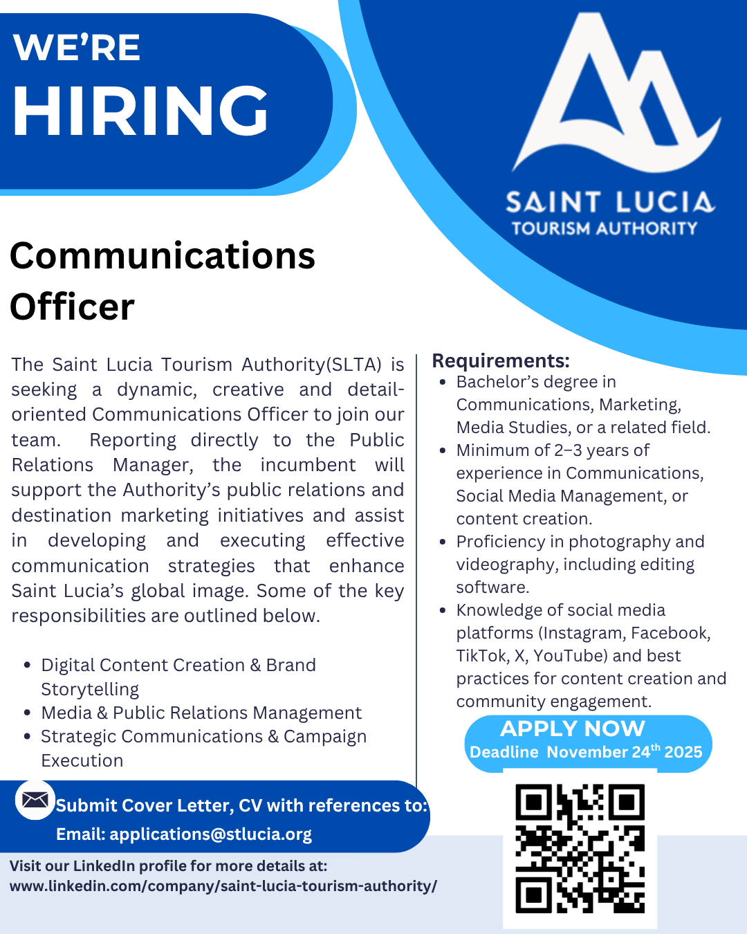 Chief Corporate Officer, Saint Lucia Tourism Authority, P.O. Box 221, Castries, Saint Lucia