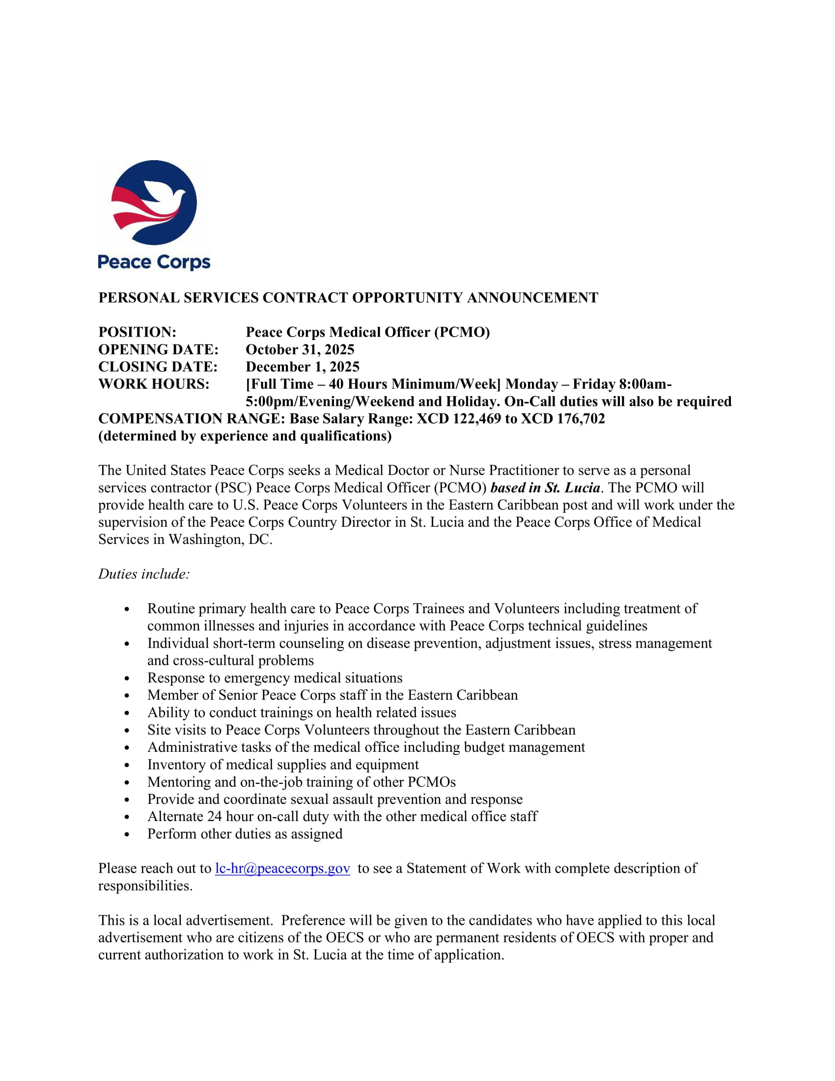 For more information on the position statement of work please reach out to . No phone calls please. For general information regarding Peace Corps in the Eastern Caribbean, please visit our website at www.peacecorps.gov/eastern-caribbean/.
