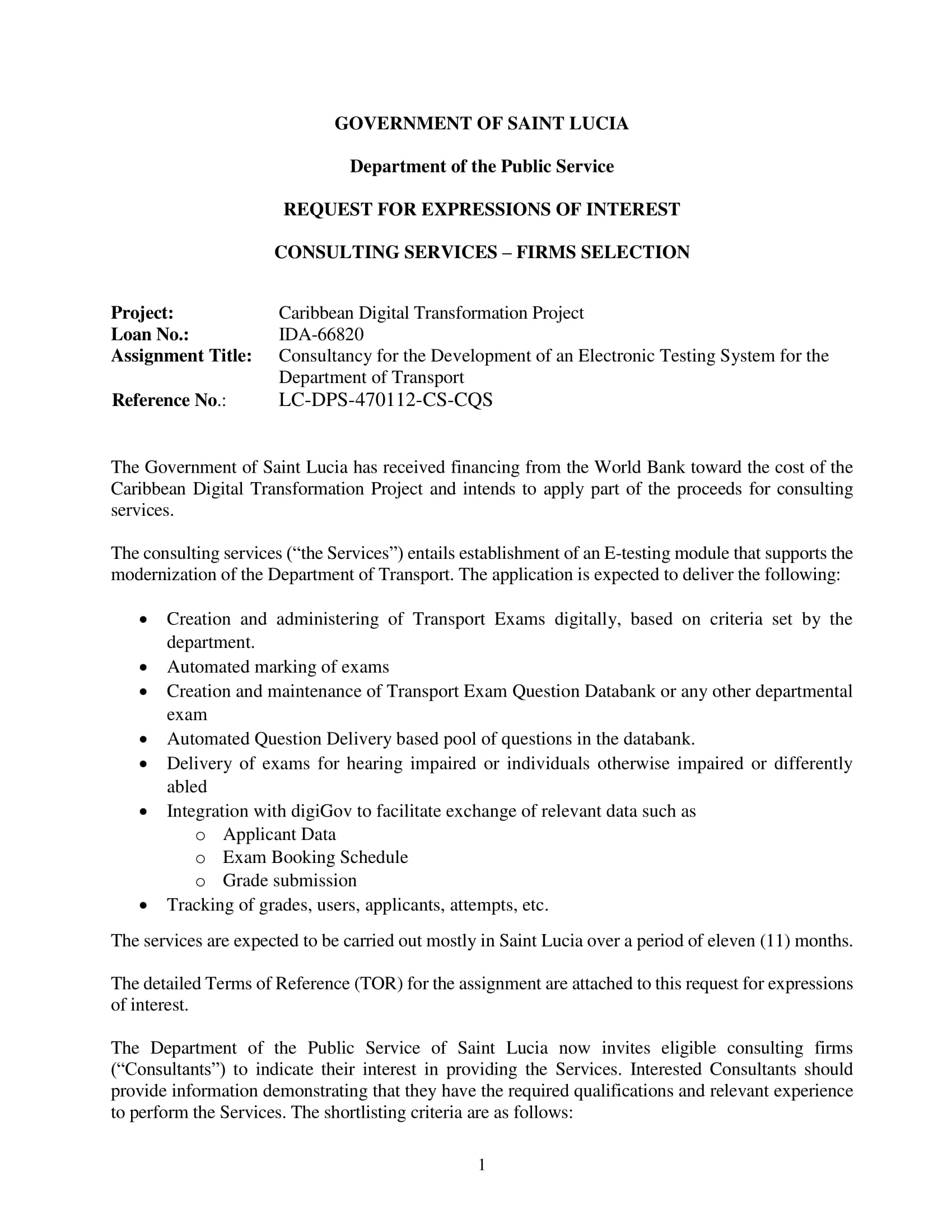 Government of Saint Lucia: Consultancy for the Development of an Electronic Testing System for the Department of Transport