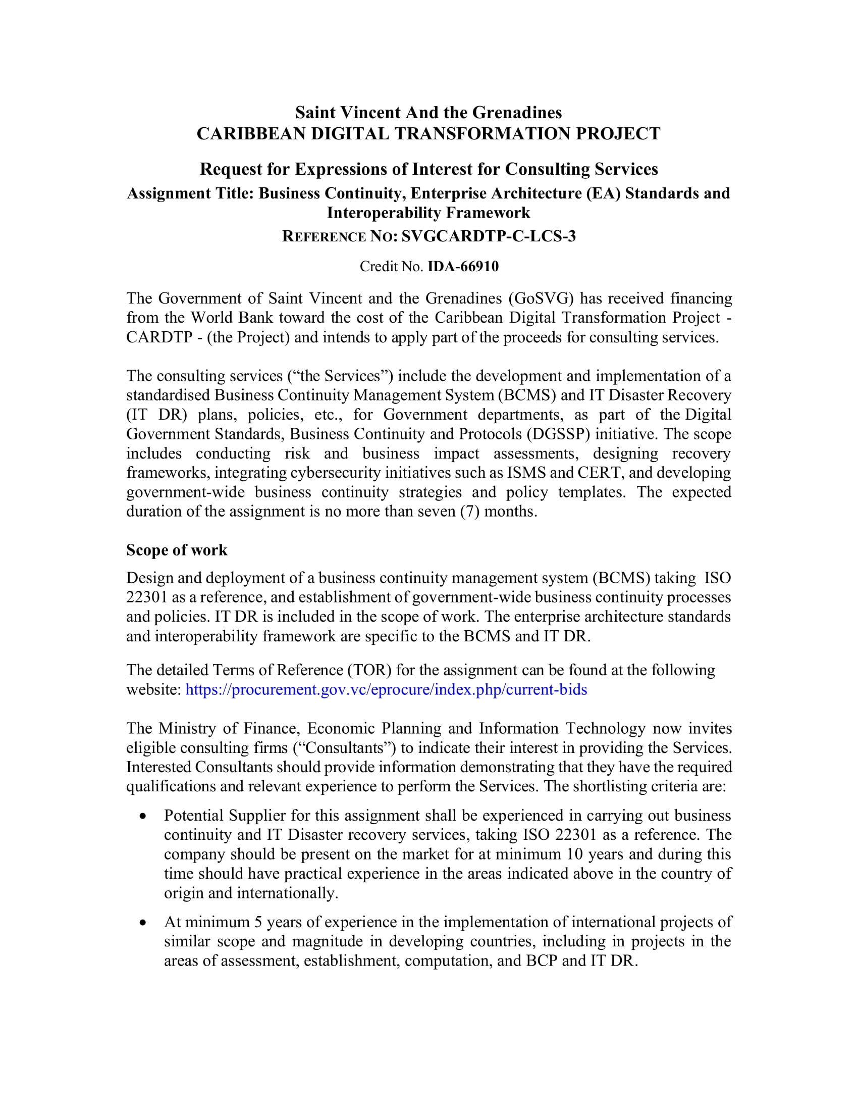 Expressions of interest must be delivered in a written form to the address below (in person, by mail, or by e-mail) by Friday, February 13, 2026, 1600 hours (SVG Local time).
