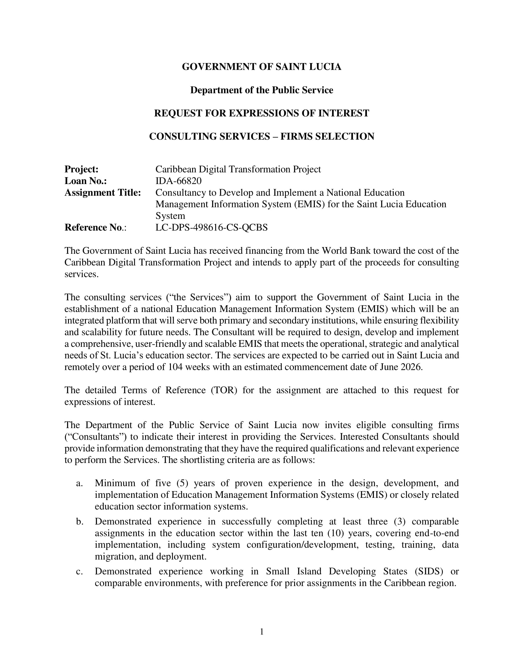 Government of Saint Lucia: Caribbean Digital Transformation Project - Consultancy to Develop and Implement a National Education Management Information System (EMIS) for the Saint Lucia Education System