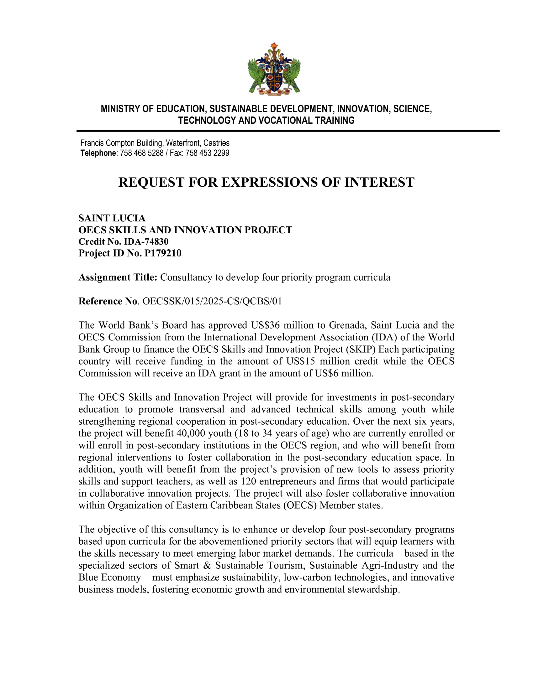 Expressions of Interest must be submitted electronically only via the Government of Saint Lucia Electronic Government Procurement (e-GP) System – https://in-tendhost.co.uk/goslprocurement no later than 9:30 a.m. local time on December 3, 2025.