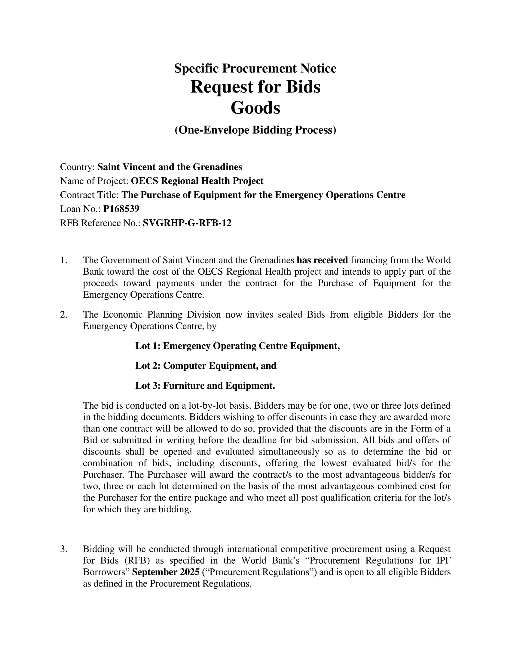Government of St. Vincent and the Grenadines: OECS Regional Health Project: The Purchase of Equipment for the Emergency Operations Centre